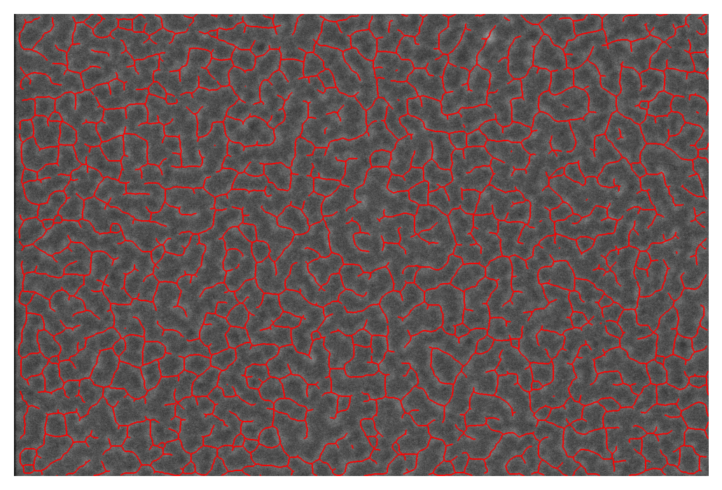 Skeleton analysis allows us to measure fine structure in samples. In this case, we are going to measure the network formed by a protein called spectrin inside the membrane of a red blood cell, either infected by the malaria parasite Plasmodium falciparum, or uninfected.