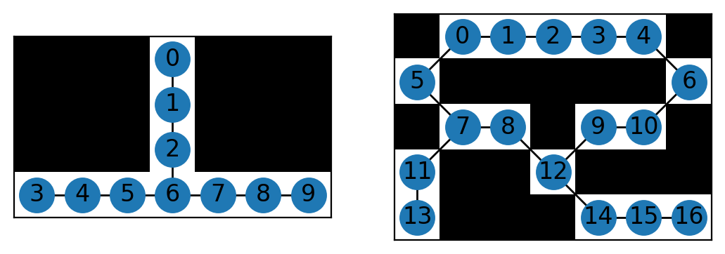 These intermediate objects contain all the information we need from the skeleton, but in a more useful format. It is still difficult to interpret, however, and the best option might be to visualise a couple of minimal examples. Skan provides a function to do this. (Because of the way NetworkX and Matplotlib draw networks, this method is only recommended for very small networks.)